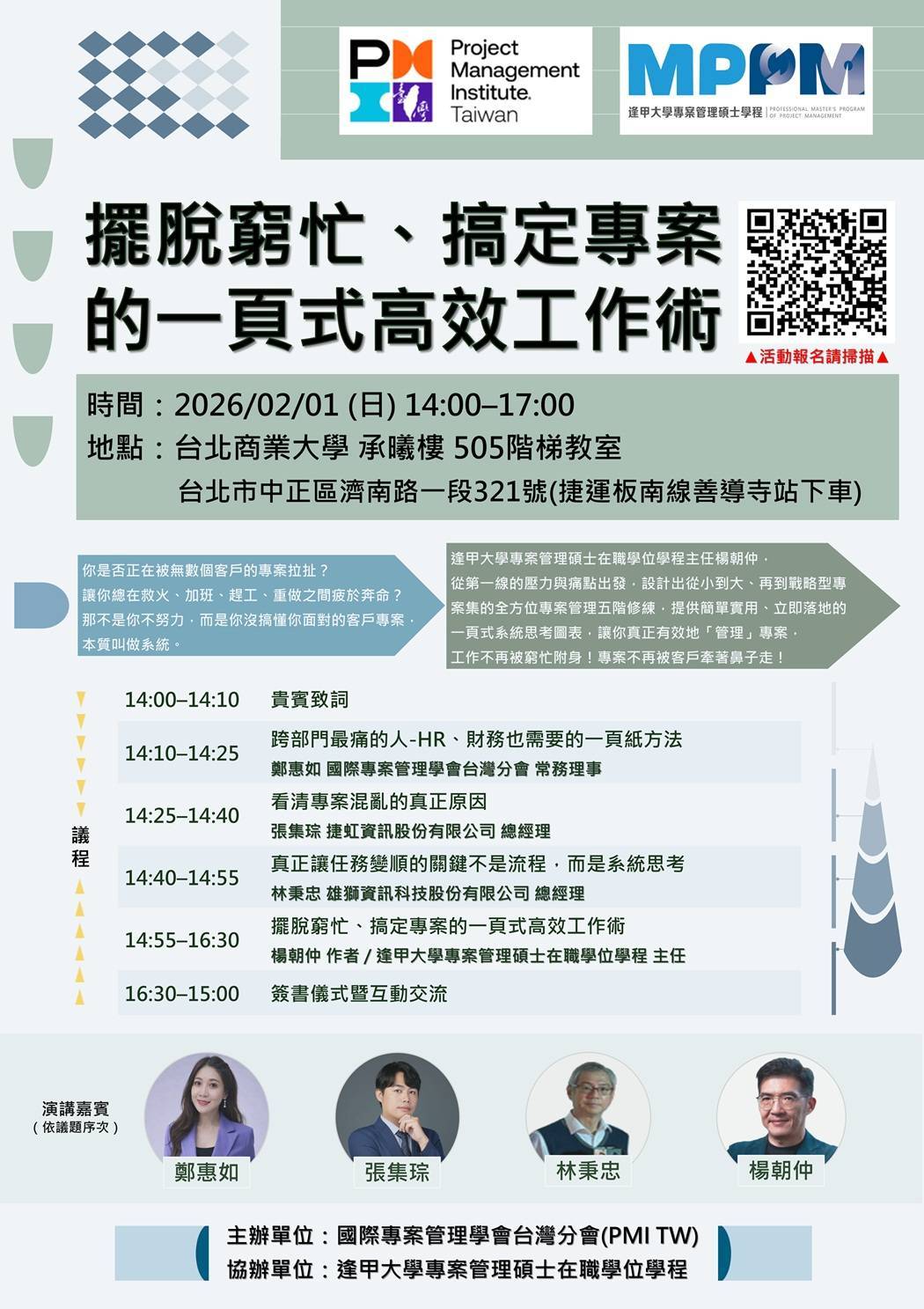 | 14:10-14:25 | 跨部門最痛的人-HR、財務也需要的一頁紙方法 | 鄭惠如 PMI Taiwan常務理事 |
